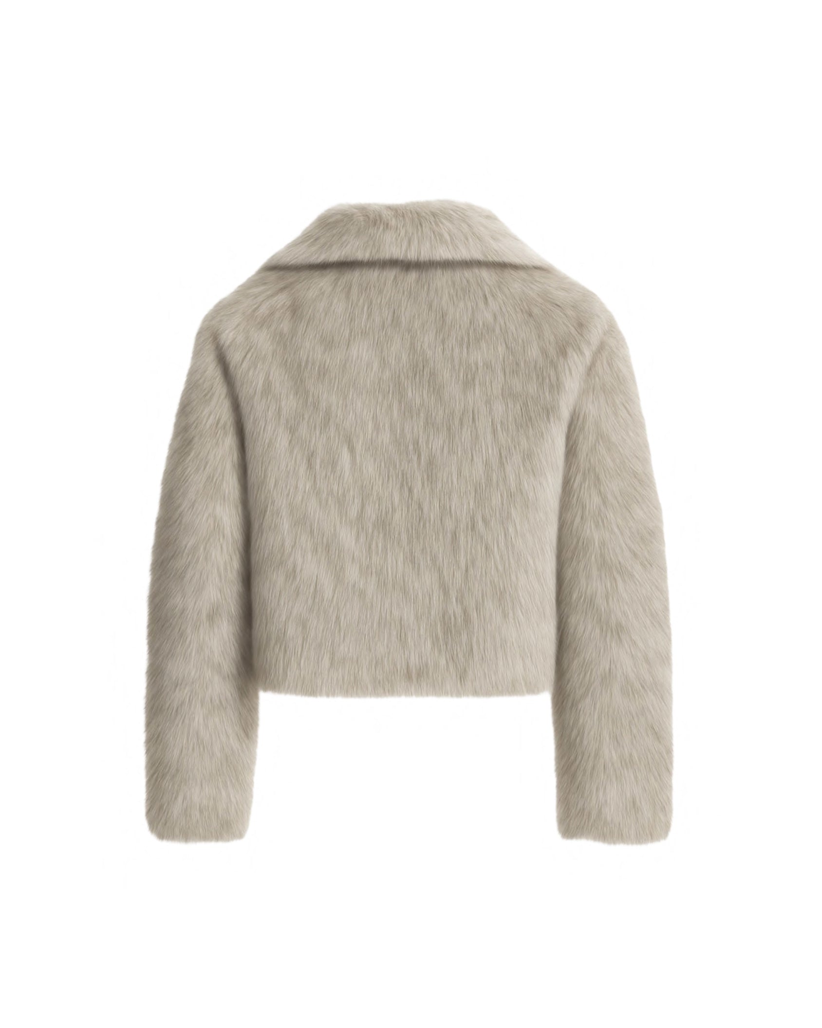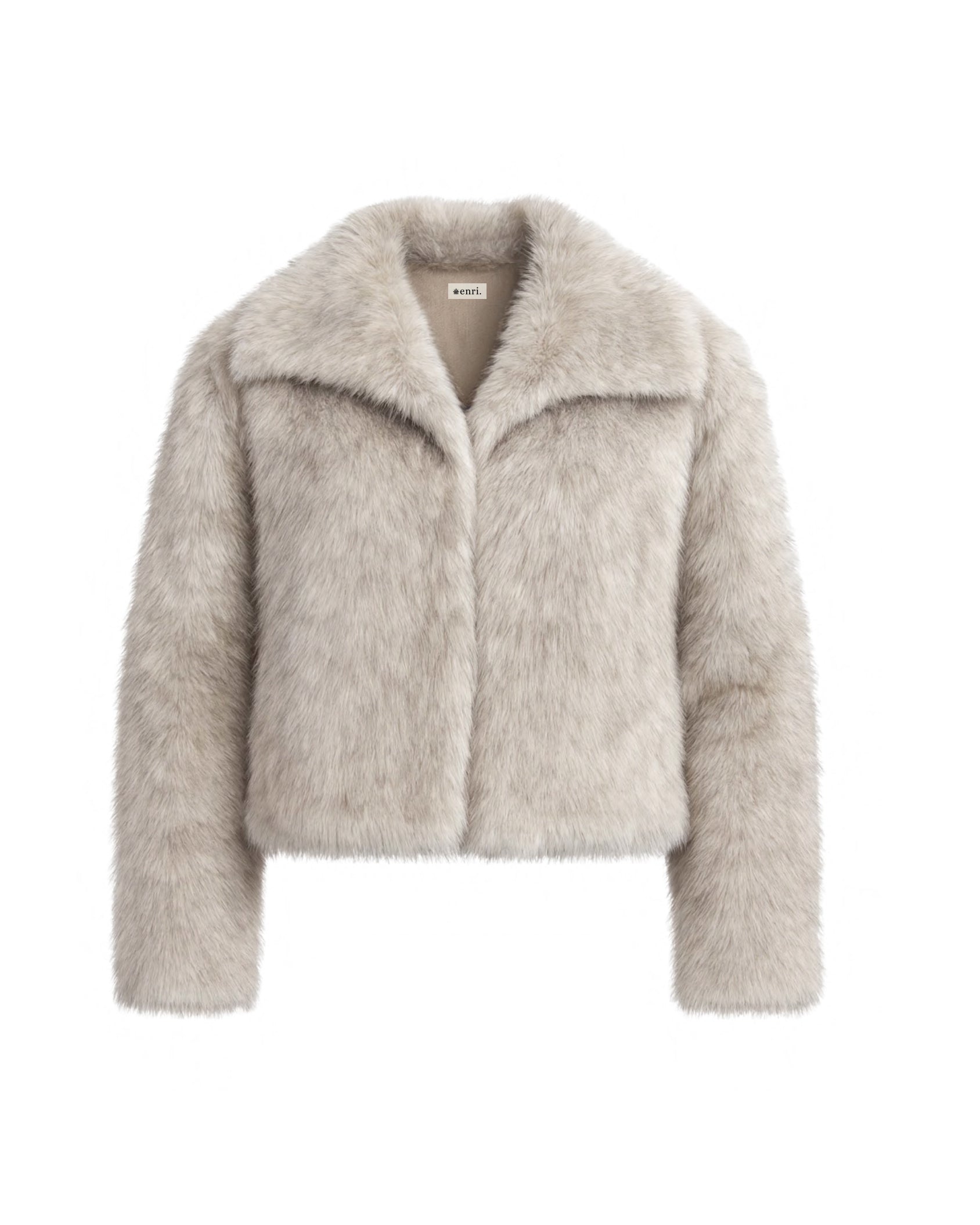Manteau en fausse fourrure avec un large col enveloppant. Volume légèrement oversize et coupe droite évasée jusqu’à la taille pour une allure très mode. Fermeture par crochets. Poches discrètes.