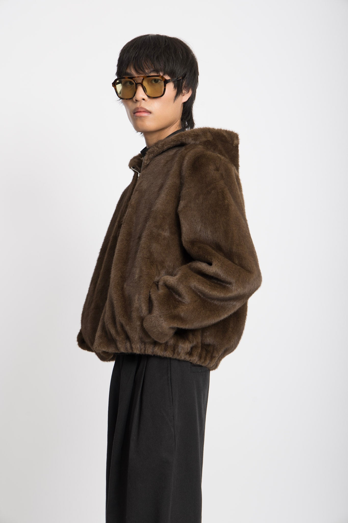 Manteau à capuche en fausse fourrure, couleur café. Volume légèrement oversize, arrondi et élastiqué sur la taille. Coupe sportswear-chic avec deux poches passepoilées. Fourrure polyester. Fermeture zippée.