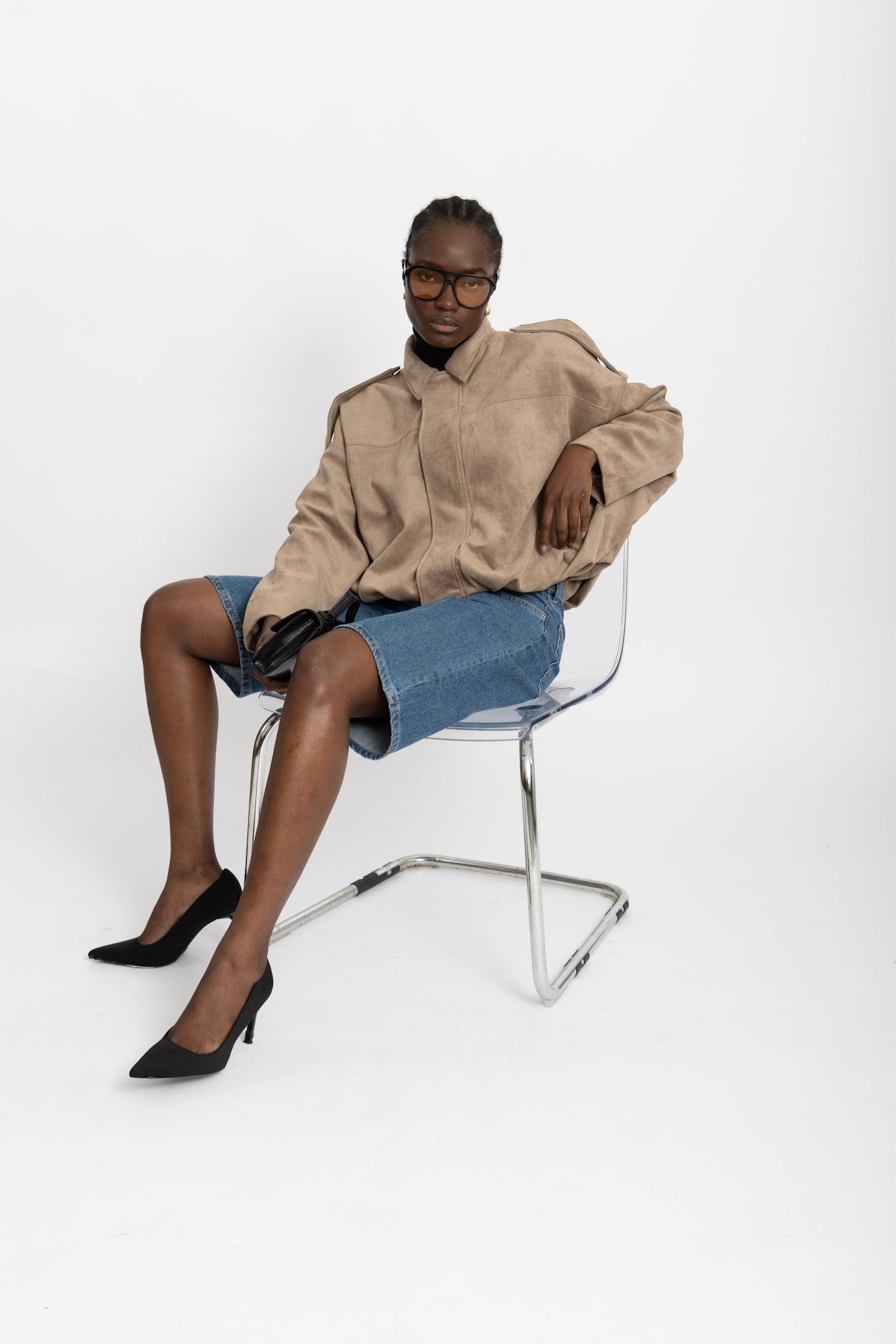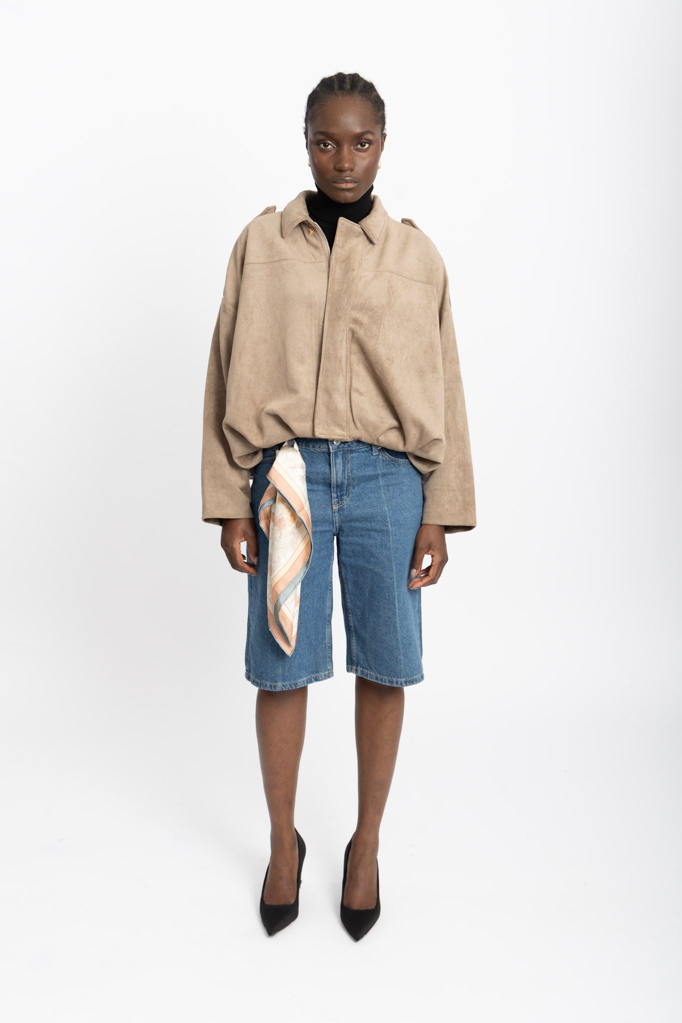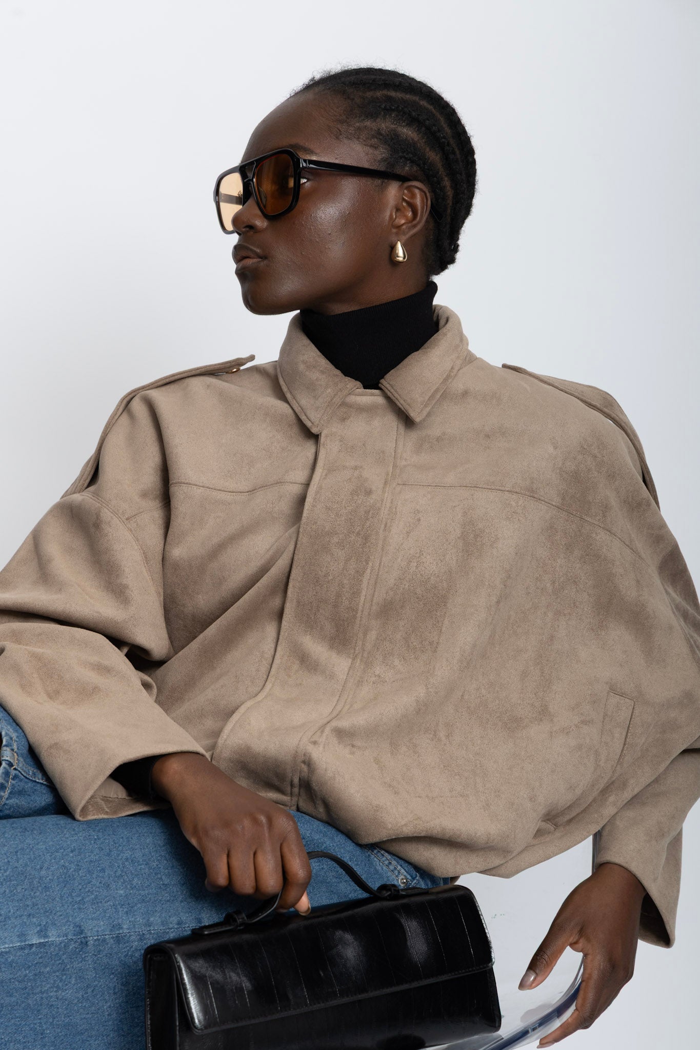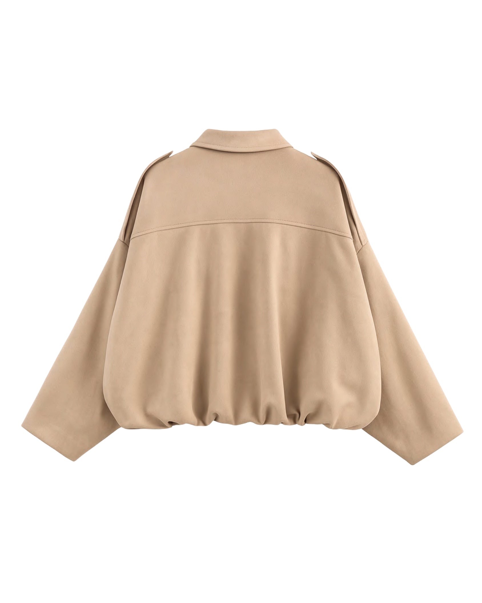 Veste effet suédé avec structure chemise et fermeture zippée complétée de deux boutons pression. Manches longues chauve-souris. Coupe au volume ballon resserré par une taille élastique. Deux poches passepoilées latérales. Une pièce moderne, structurée et ultra facile à porter.